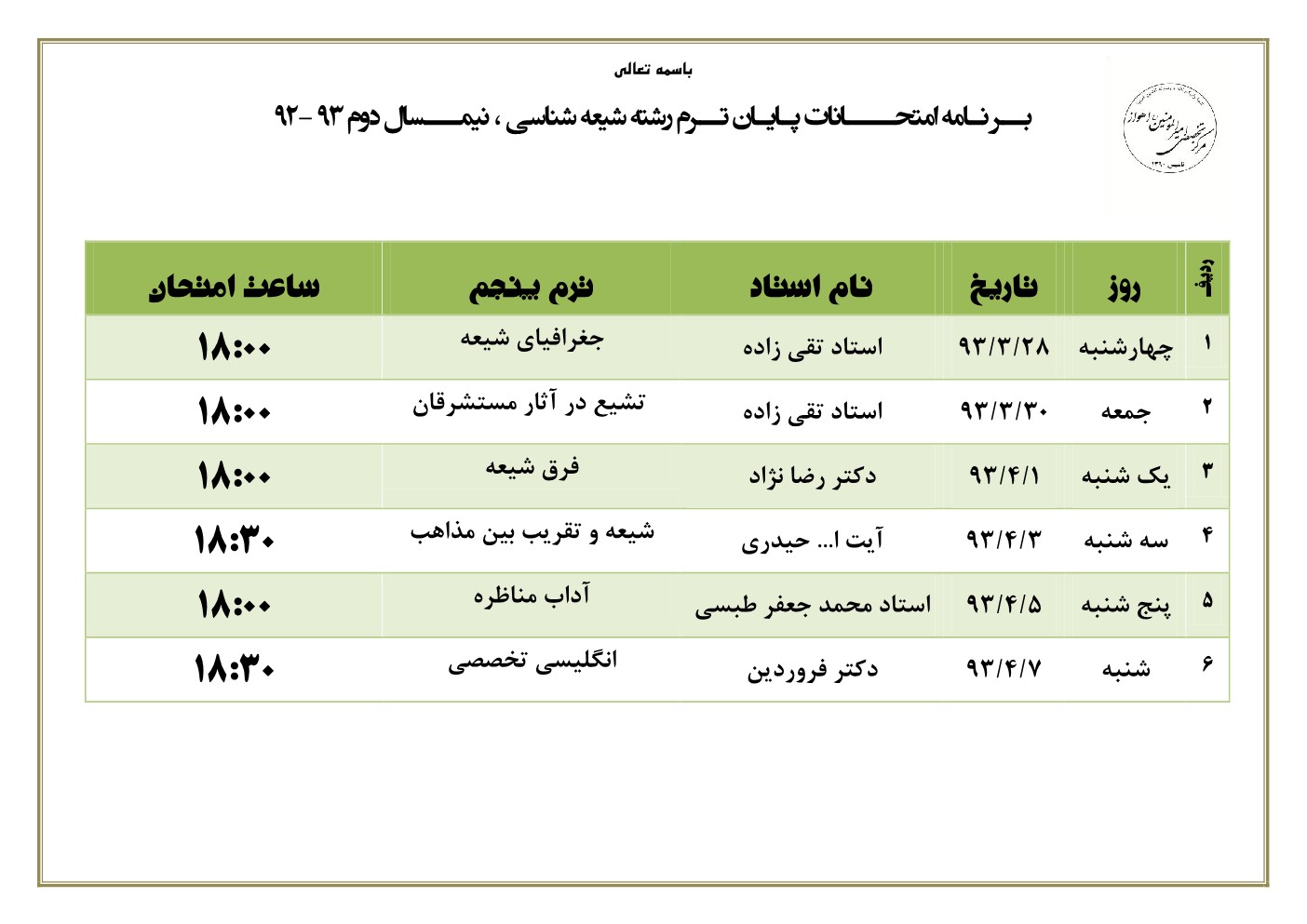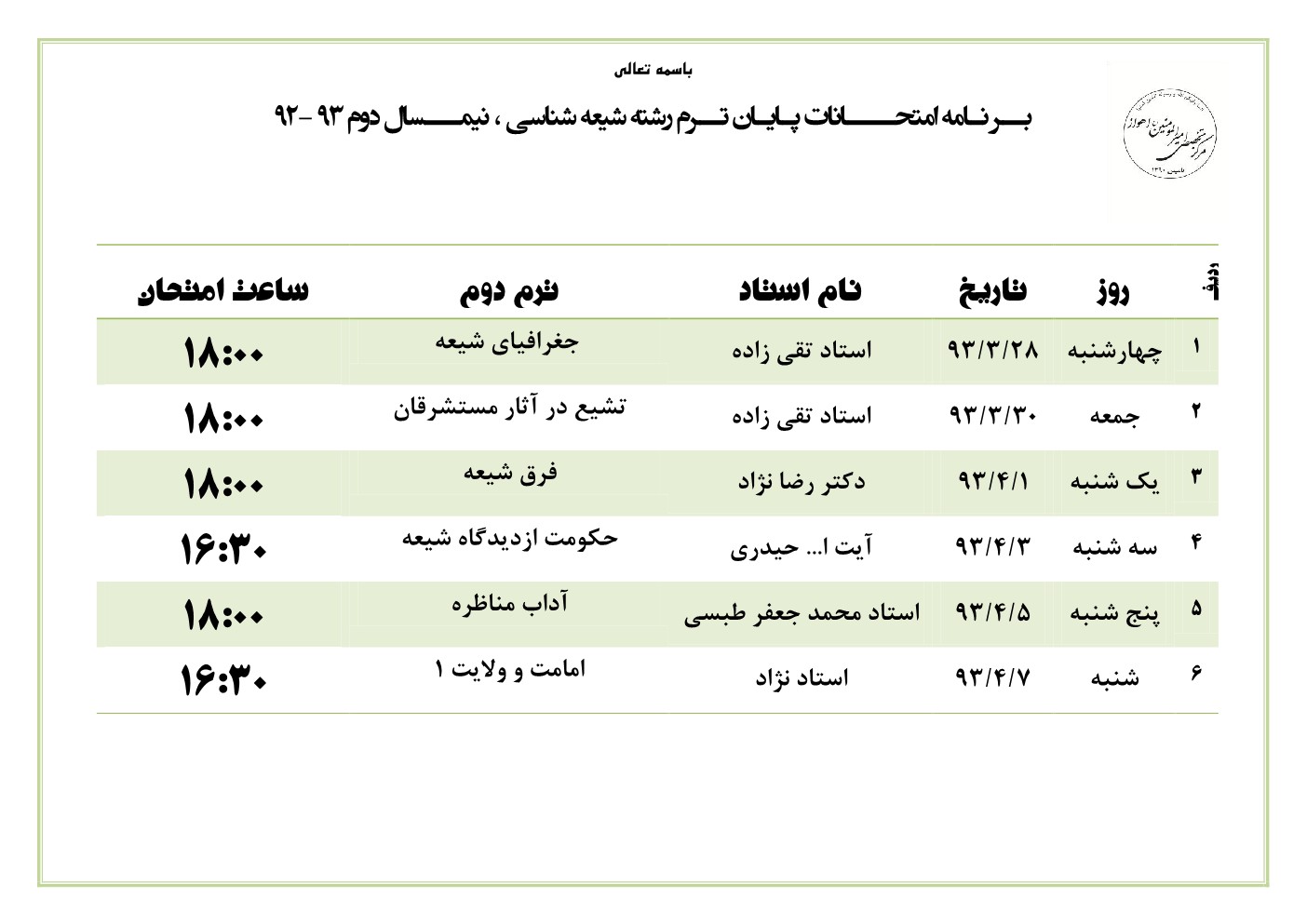 برنامه امتحانات ترم دوم