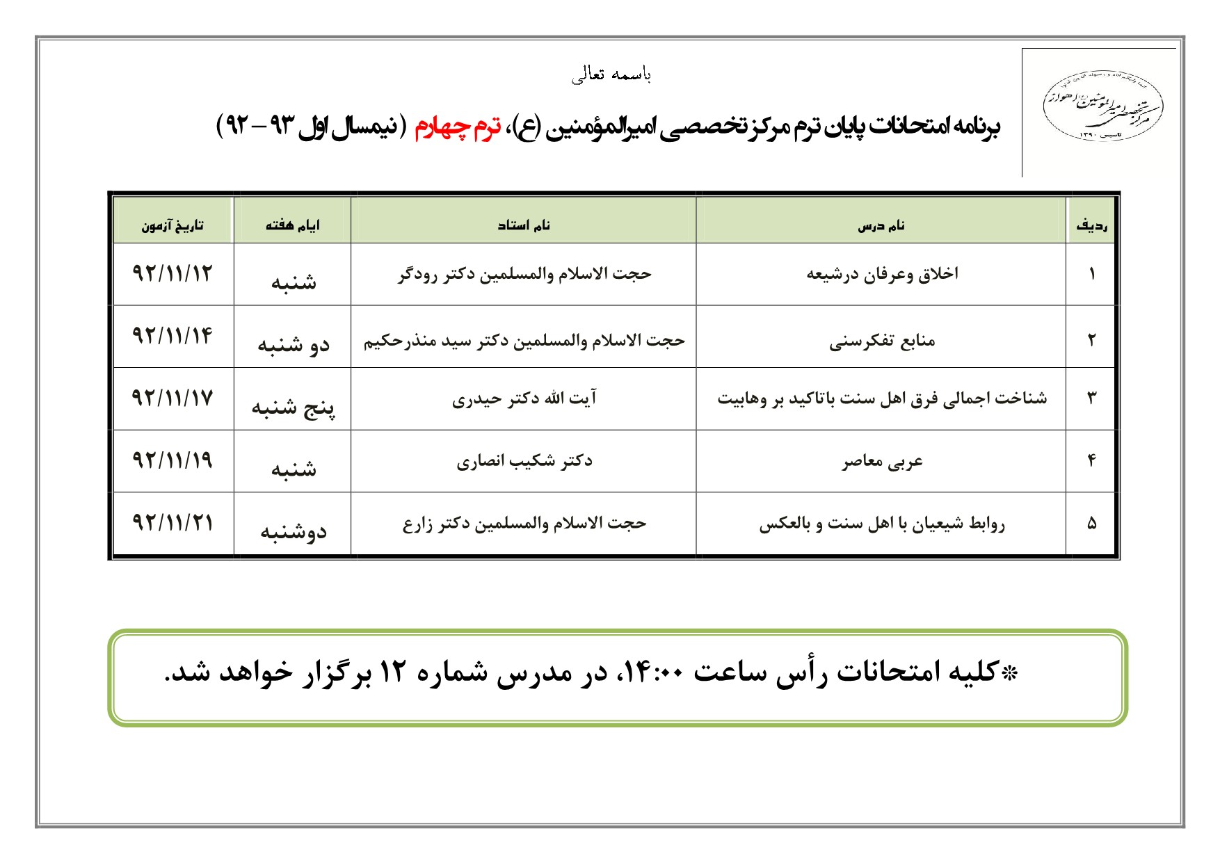برنامه امتحانات پایان ترم مرکز تخصصی امیرالمومنین ترم چهارم