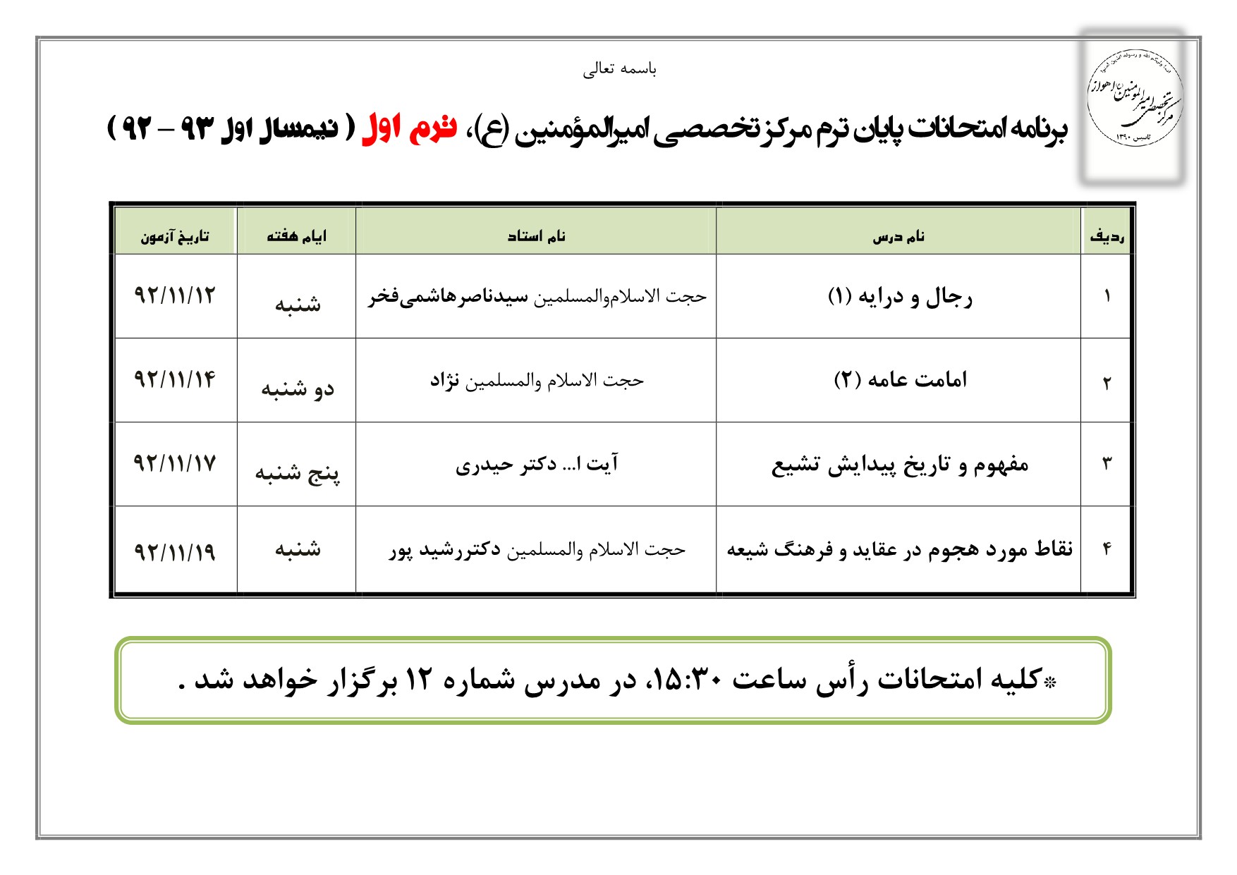برنامه امتحانات پایان ترم- ترم اول 93-92